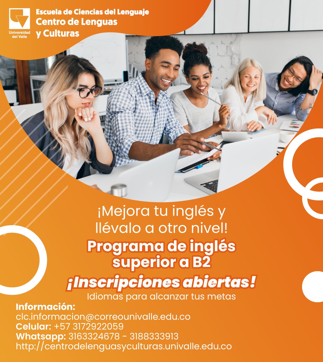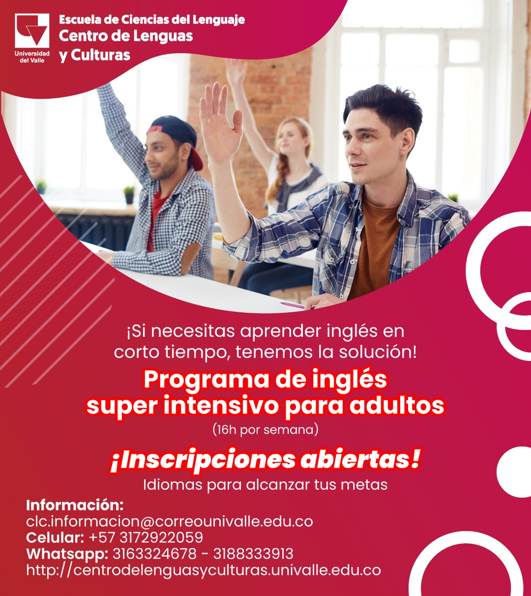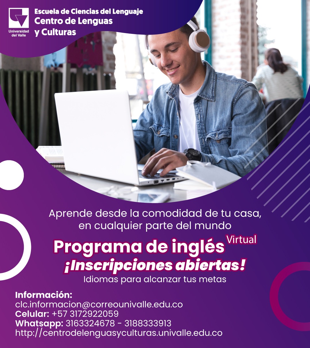 El Centro de Lenguas y Culturas informa que tiene abiertas las inscripciones para el período febrero - junio de 2024 en sus sedes de Cali: https://centrodelenguasyculturas.univalle.edu.co/inscripciones-cursos-idiomas