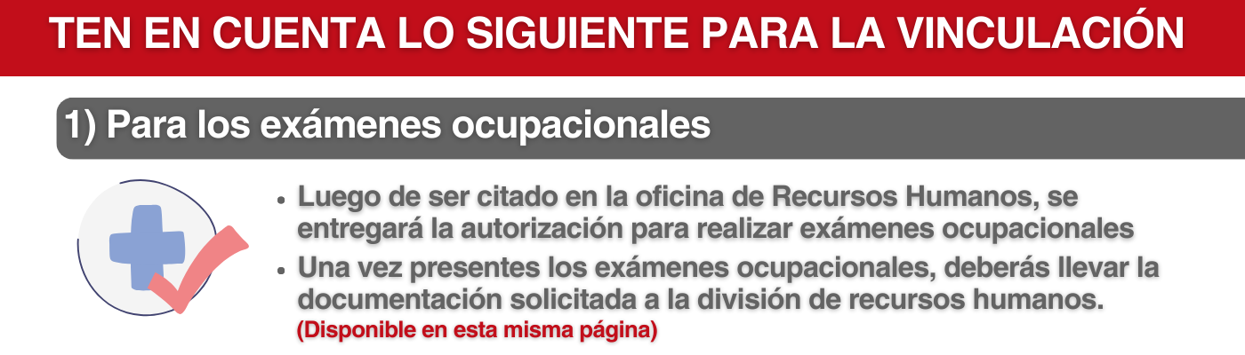 El día que usted haya sido citado en la oficina de Recursos Humanos se entregará la autorización para realizar los exámenes ocupacionales. Es importante llevar esta autorización a la cita asignada por la Unidad de Salud Ocupacional - USO.